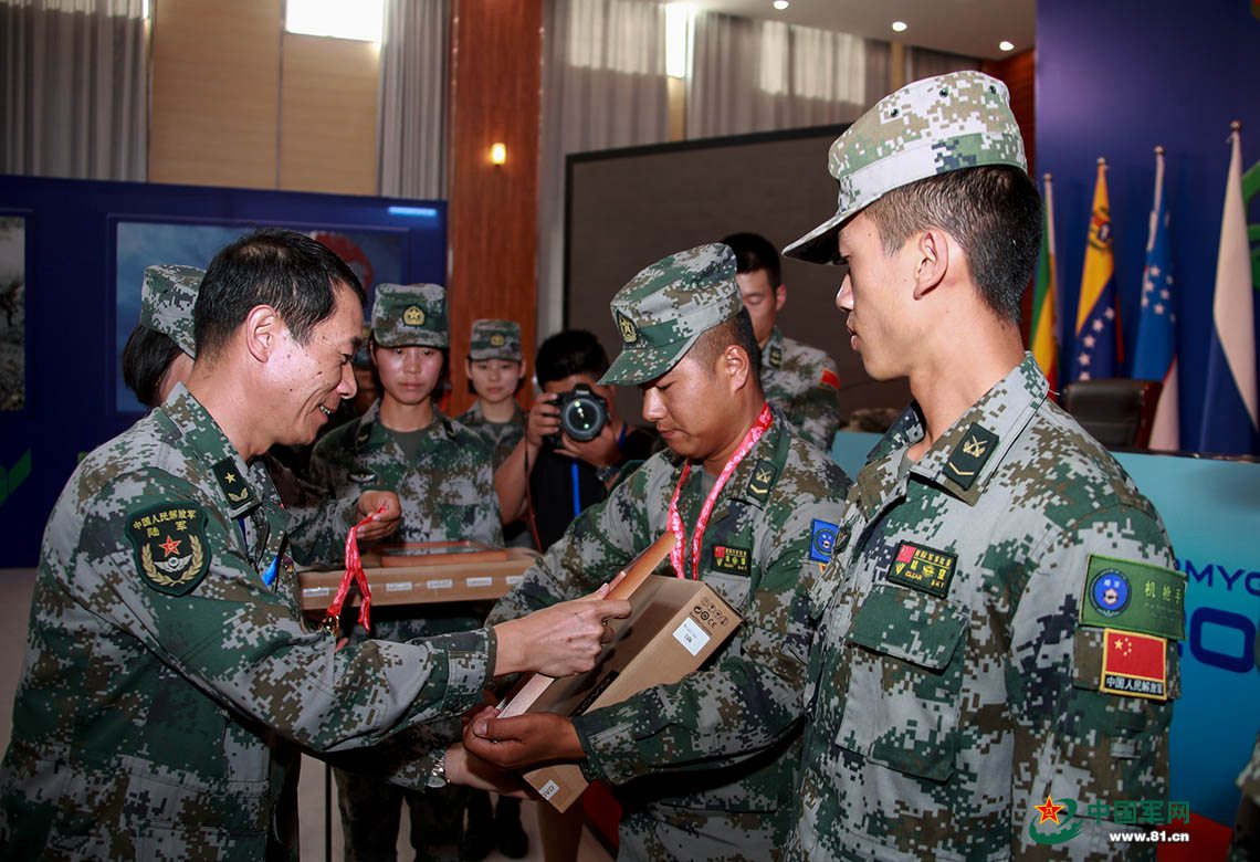 “晴空”项目裁判长洪江强少将为中方参赛选手颁奖。袁凯 摄