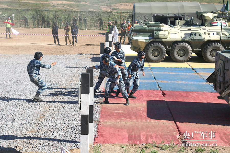 中国参赛车组凭借精湛的驾驶技术和过硬射击技能,以命中10个目标,总用时32分32秒,“零罚时”的优异成绩完成“战车接力赛”比赛科目