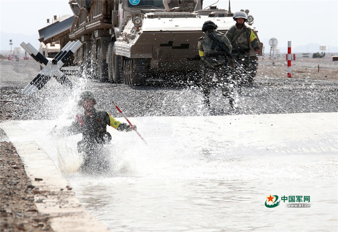 中方参赛官兵深入浅滩标示通路。袁凯 摄