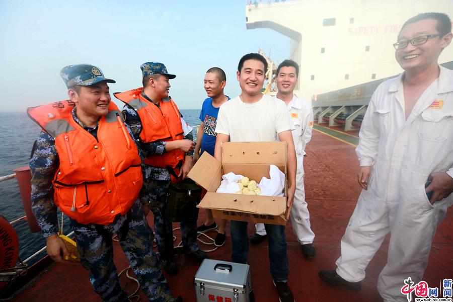 海军徐州舰通过小艇向船员送来刚做好的包子。张千 摄