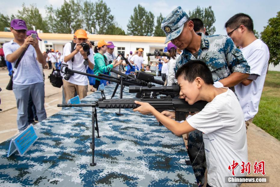 这是《中国人民解放军军营开放办法》颁布后的首个全国性大型军营开放活动。这次军营开放活动除了传统的军事科目演示,还增设了参观荣誉室、实兵实装演练和互动性体验项目,邀请市民品尝野战食品,亲身体验轻武器拆装、模拟跳伞训练等内容。图为静态装备展示上小朋友体验轻武器。 中新社记者 张畅 摄