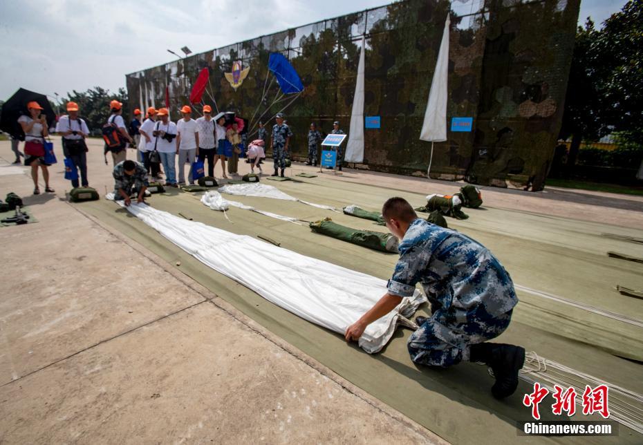 武汉市民参观士兵整理伞具。 中新社记者 张畅 摄