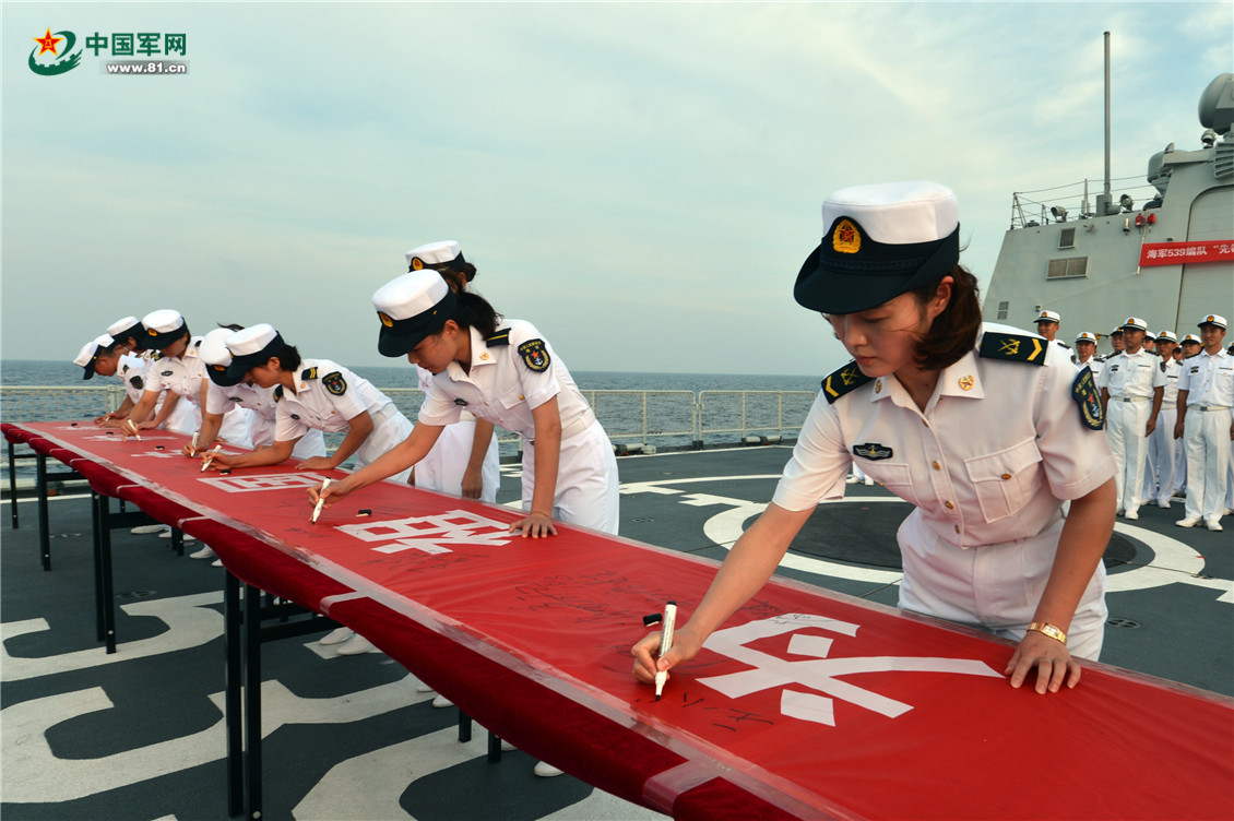 芜湖舰女兵在横幅上签名留念。张海龙 摄