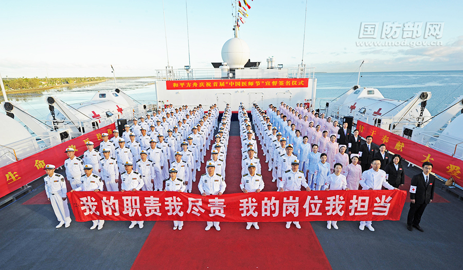 8月17日,在汤加努库阿洛法港,和平方舟医务人员展示“我的职责我尽责 我的岗位我担当”签名横幅。