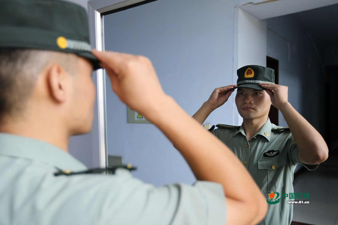 一名新排长正在军容镜前整理军容。