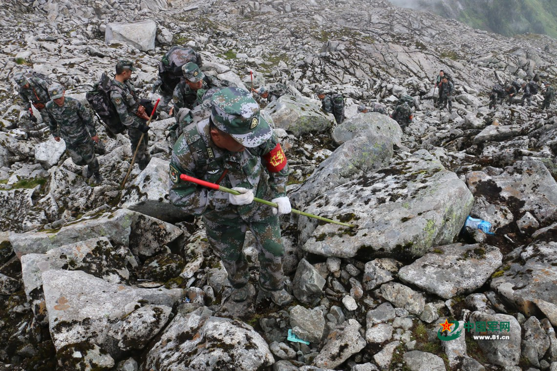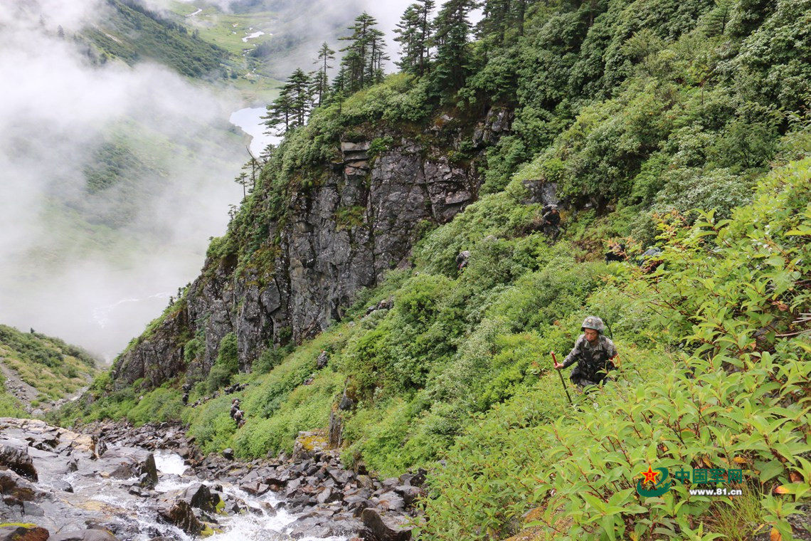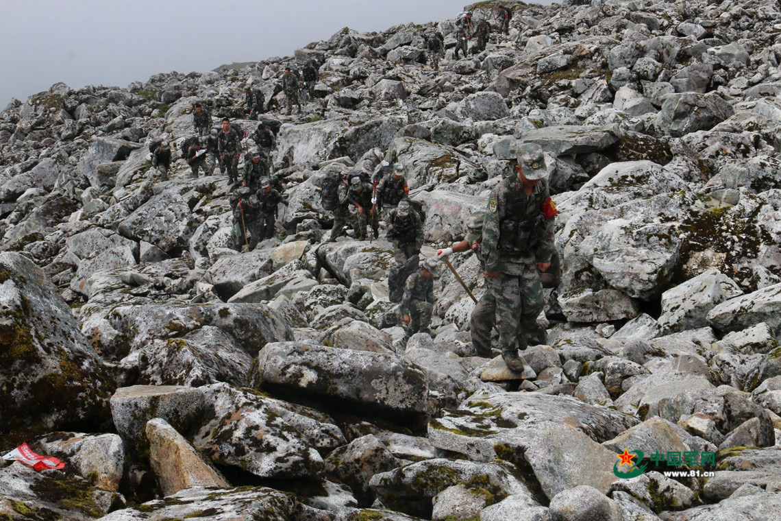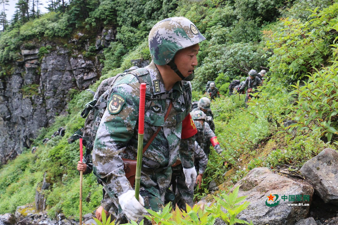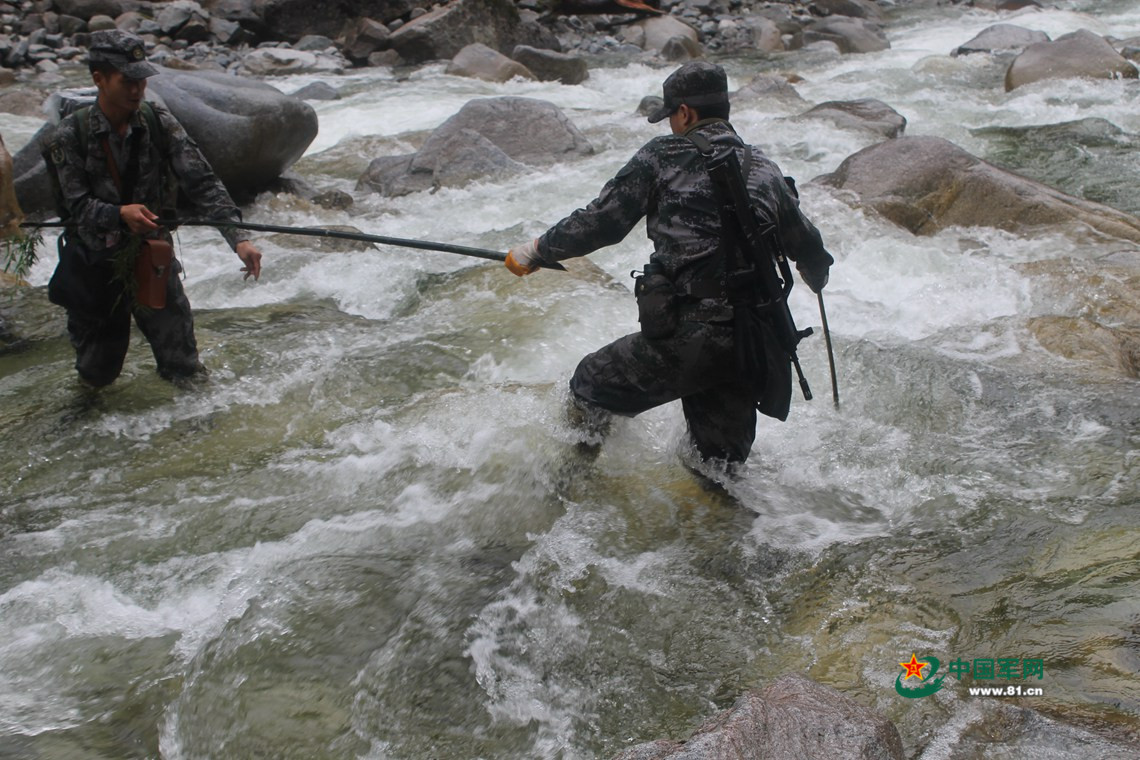 官兵们只能淌过泥流