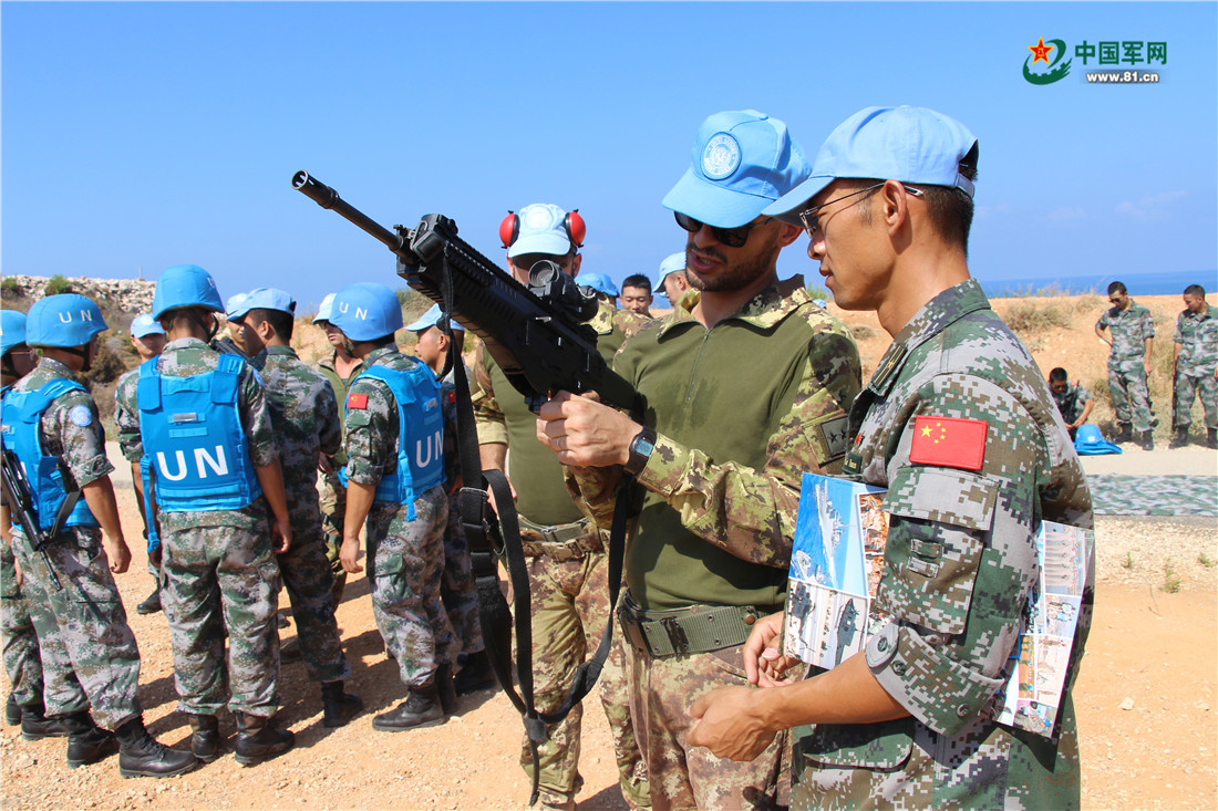 意大利士兵给中国维和官兵介绍贝瑞塔ARX-160突击步枪操作使用方法