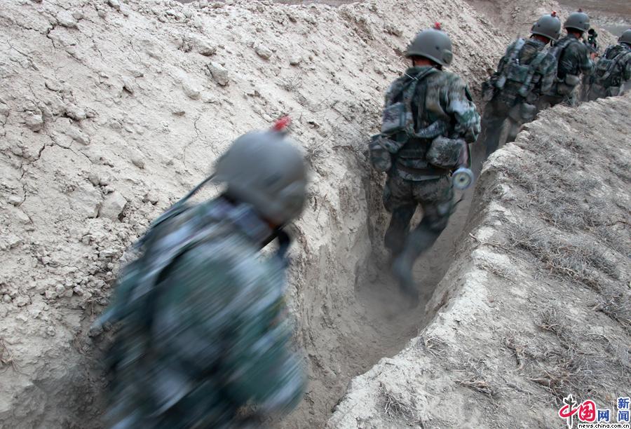 夺占蓝军阵地的红方官兵在堑壕内搜索前进。
