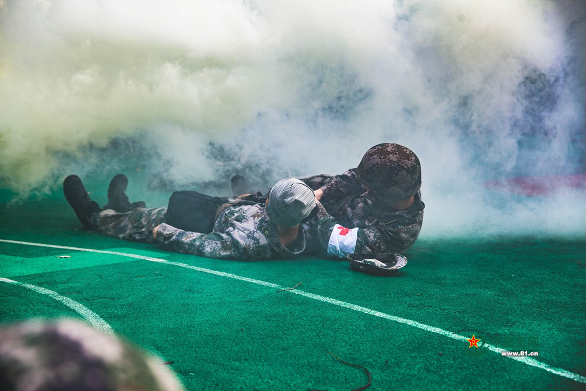 某战士头部受伤,卫勤人员突破“敌”封锁对伤员进行救治。