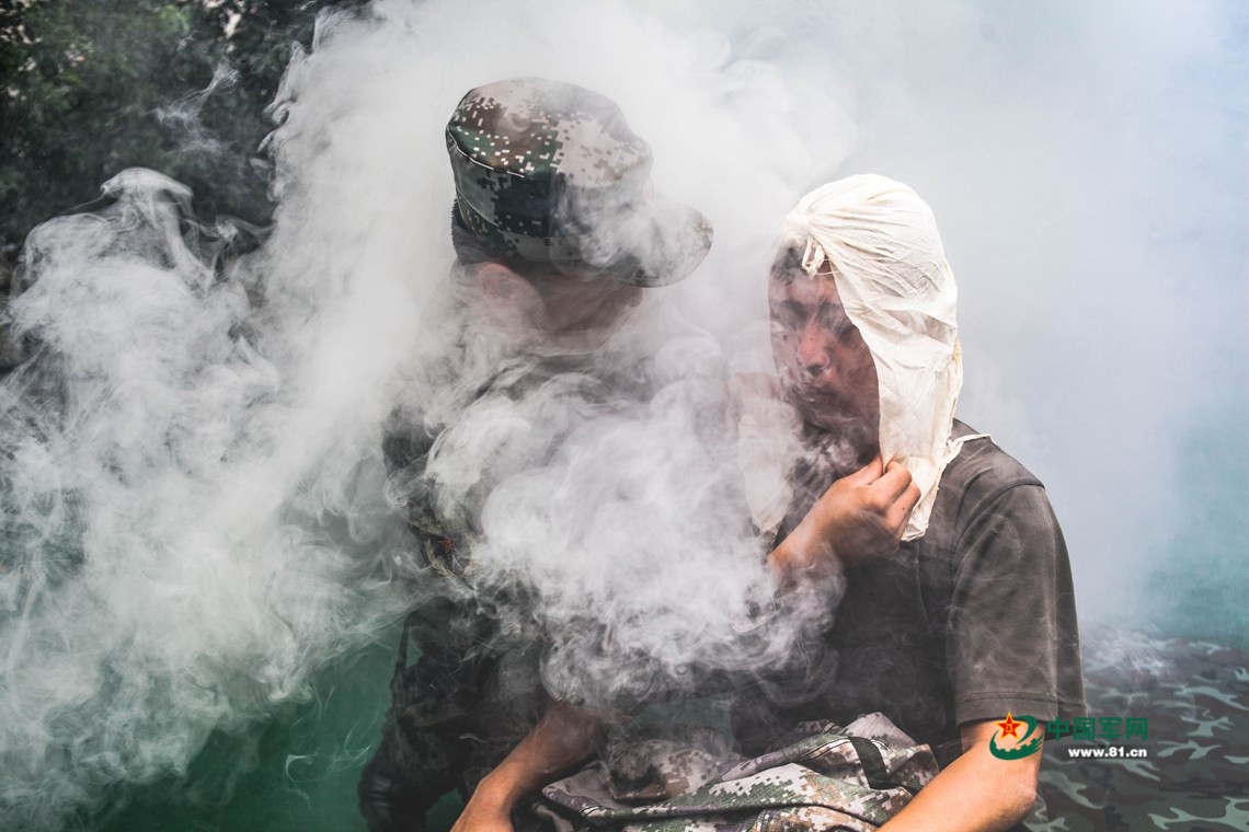 硝烟弥漫,为“受伤”战友包扎。训练场上的很多人都不是医生,他们来自各个战线,有司机,有炊事员,有机关参谋等人员,此次练兵比武活动全员参与,效果良好。