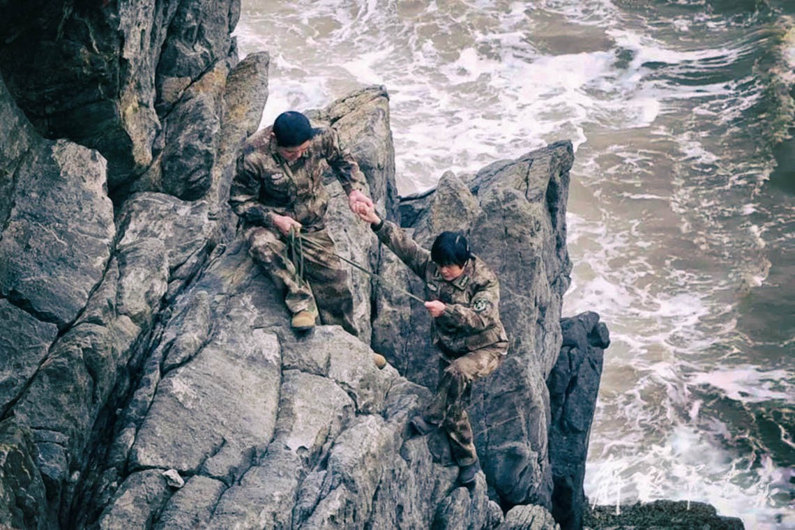 王继才夫妇用背包绳互相拴住巡逻。资料图