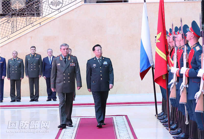 中央军委委员、军委联合参谋部参谋长李作成与俄总参谋长兼国防部第一副部长格拉西莫夫举行会谈。图为会谈前,格拉西莫夫为李作成举行欢迎仪式,并陪同检阅俄三军仪仗队。李晓伟摄