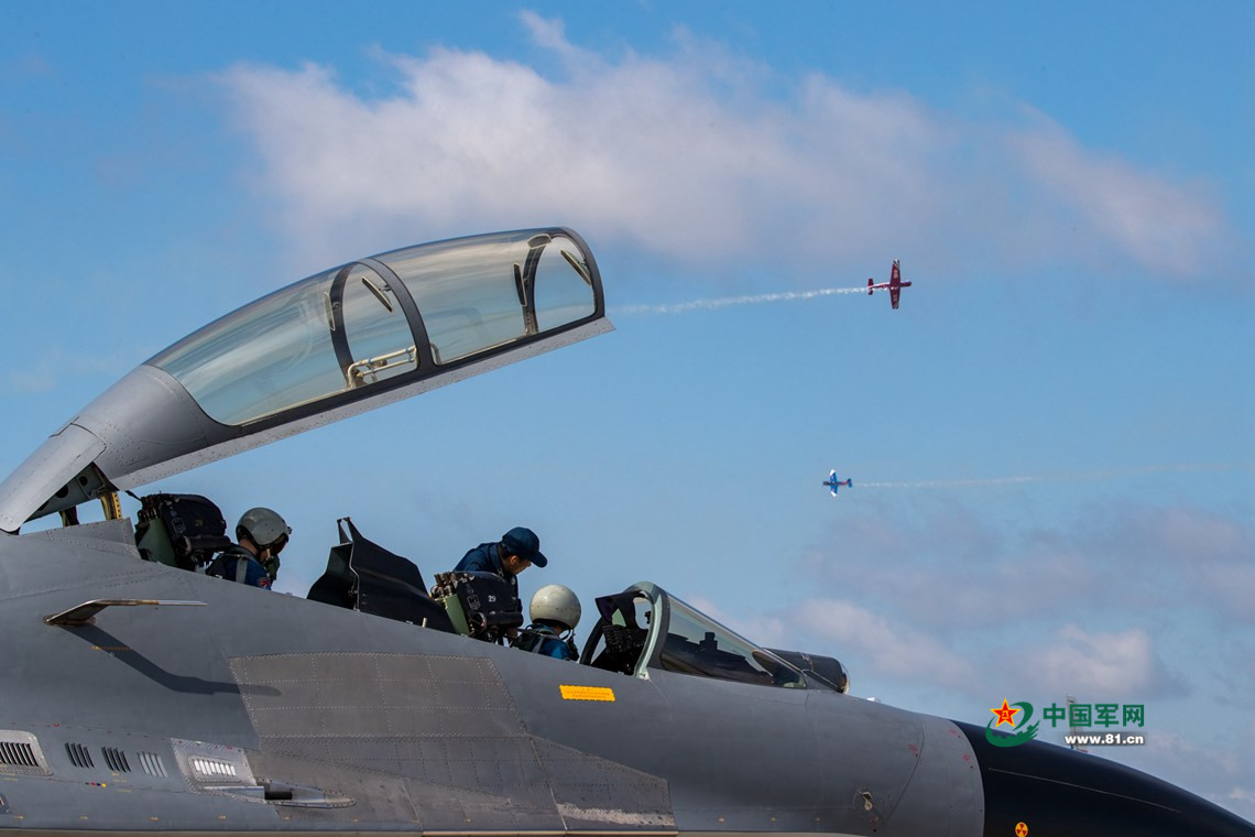 8月30日,空军航空开放活动,天空中天之翼表演队正在进行小半径盘旋。杨盼摄