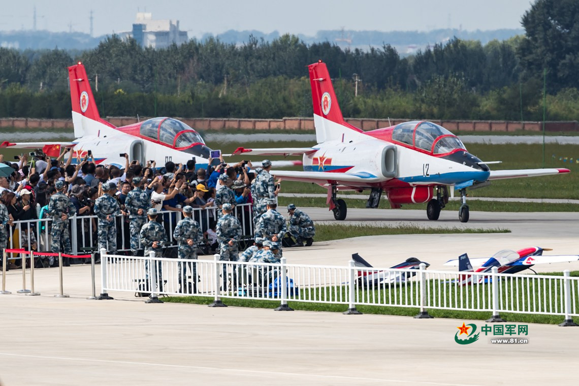 8月30日,空军航空开放活动,红鹰表演队战机滑过观众区。杨盼摄