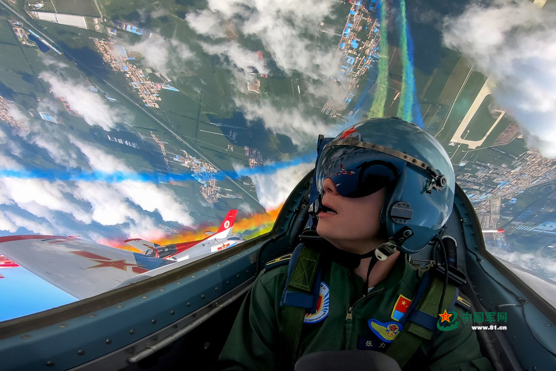8月30日,空军航空开放活动,红鹰飞行表演队拉烟筋斗展示。杨盼 摄