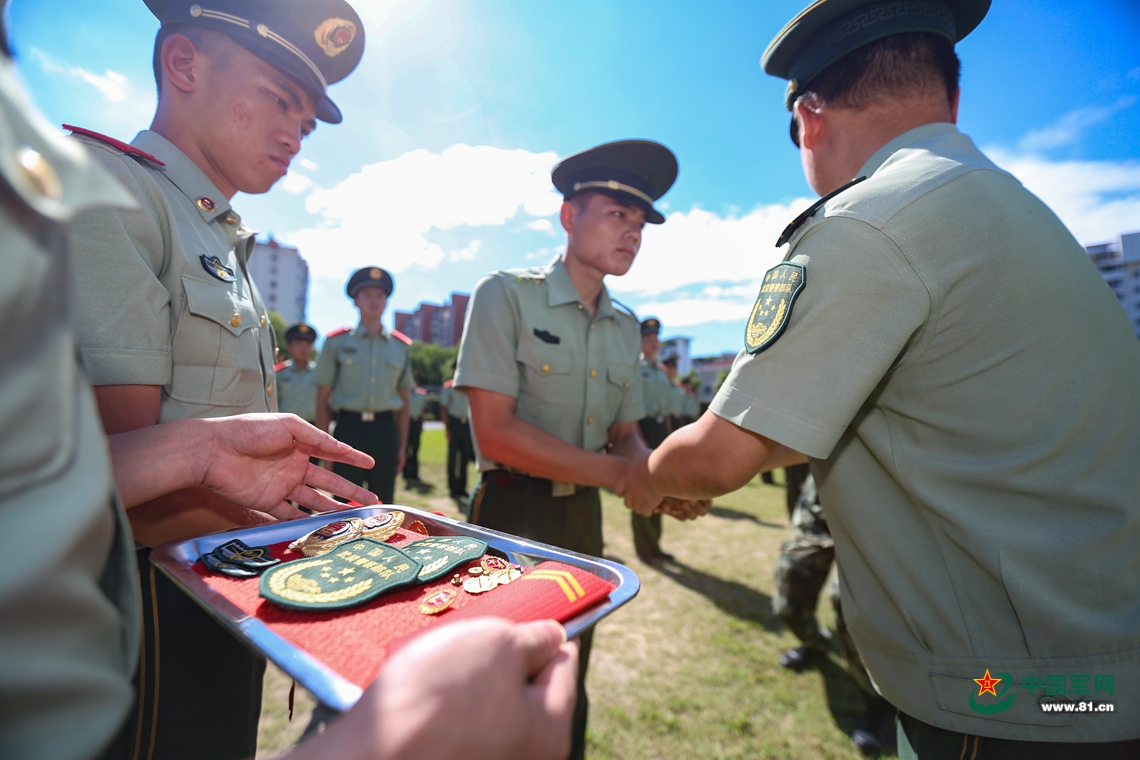 留队战友怀着恋恋不舍的心情,为退伍士兵摘去了象征军人荣誉和身份的警衔、领花、帽徽等标志性服饰。