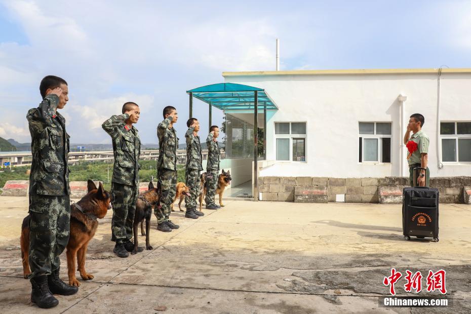 8月31日,警犬班所有训导员与警犬送别韩孟林。当日,武警贵州省总队某支队警犬班23岁的训导员韩孟林和他的警犬雷克、汉迪一起完成了退伍前的最后一次训练,与它们共处最后时光并依依惜别。又是一年退伍季,韩孟林满服役期将退出现役,在离开营区时,他放不下的不仅有战友和部队,这些并肩作战多年的”无声战友”也是他不舍的情结。中新社记者 瞿宏伦 摄