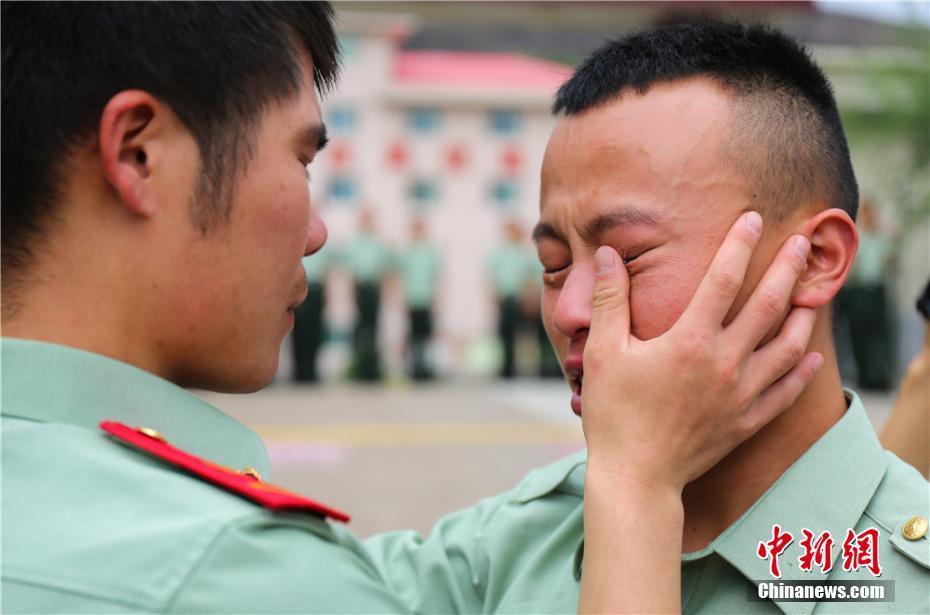 武警甘肃张掖森林支队退伍老兵泪别战友。 张小军 摄