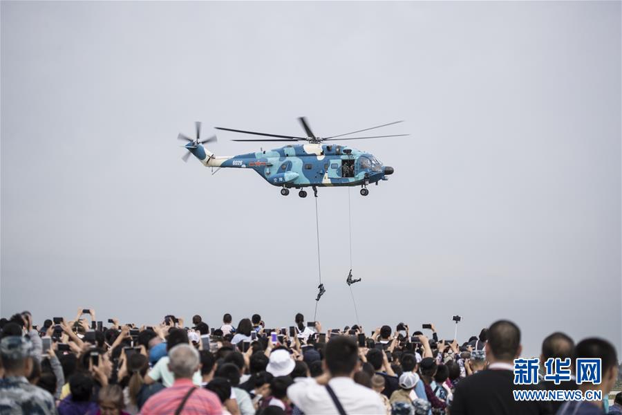 9月2日,参加空军航空开放活动的空军直升机,向社会公众展示实战化训练课目。 新华社发(廖强 摄)