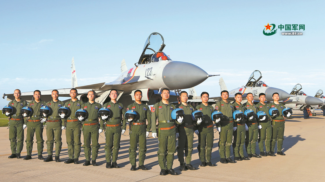 英姿勃发的舰载战斗机飞行员群体。
