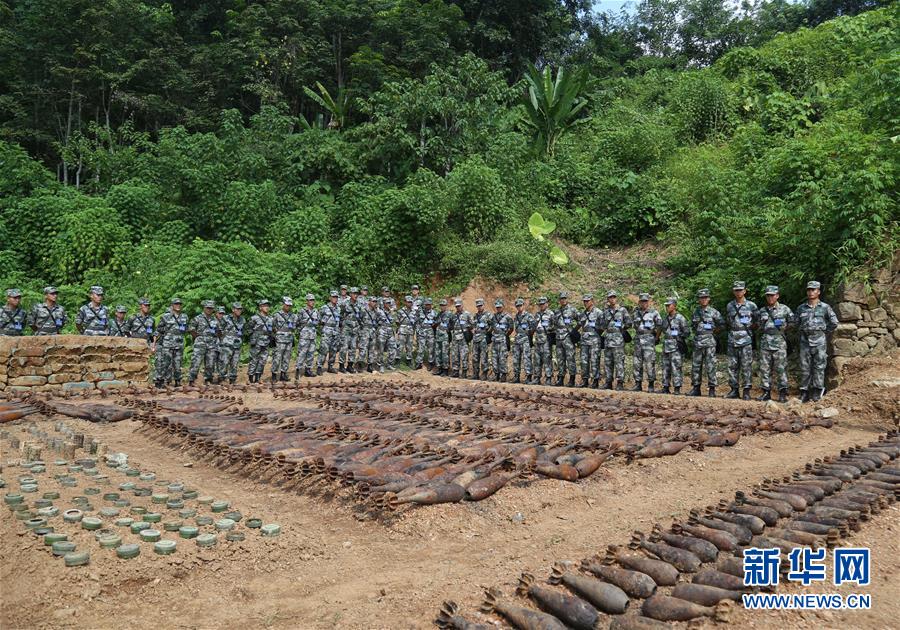 参训官兵到中越边境麻栗坡某雷场参观识别已搜排出的地雷及爆炸物(8月26日摄)。