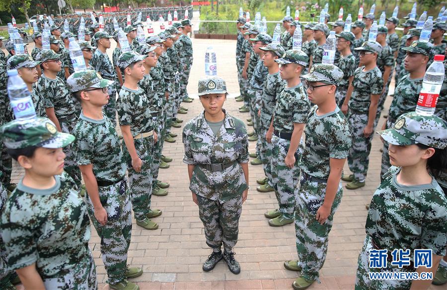 9月5日,在位于湖南省衡阳市的南华大学雨母校区,周莉慧(中)与学生们一起头顶水瓶站军姿。新华社发(曹正平 摄)