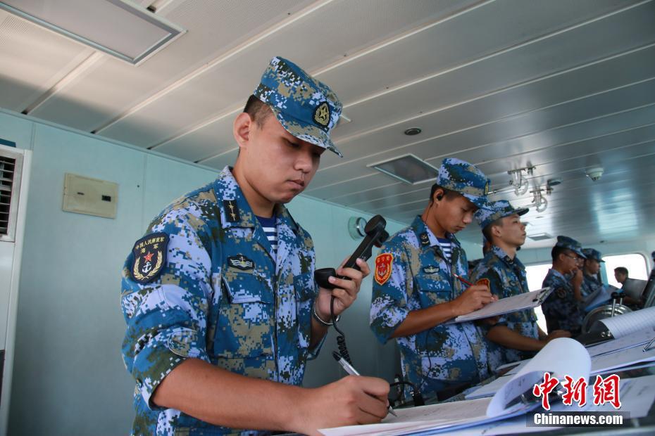 图为联演中,黄山舰与编队各舰全时保持沟通联络。中新社记者 徐广 摄
