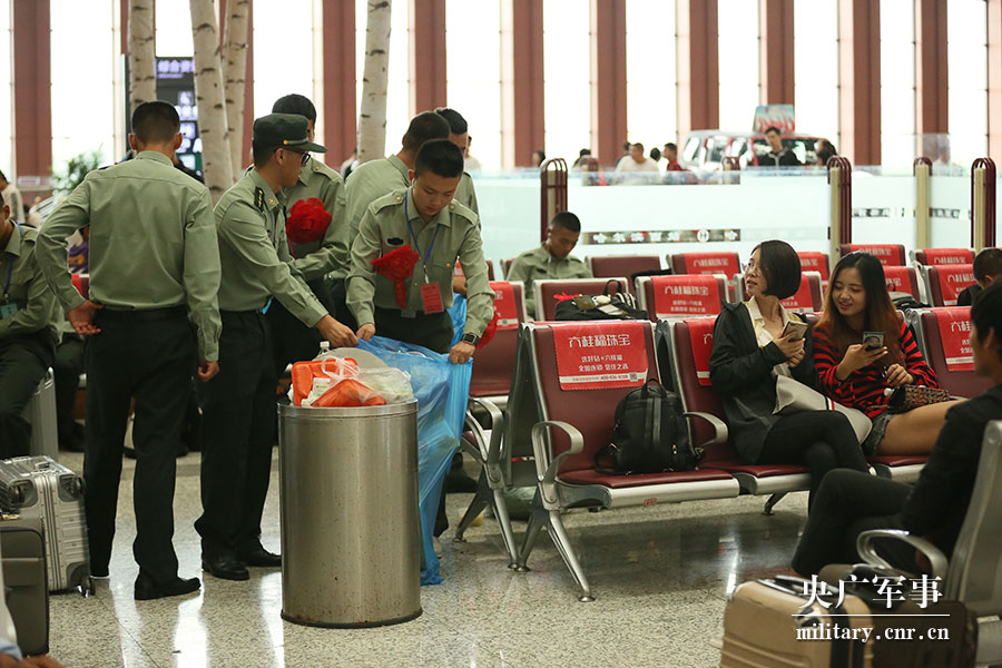 退伍战士将候车室地面的杂物清理干净,周围群众投来赞许的目光。张剑摄