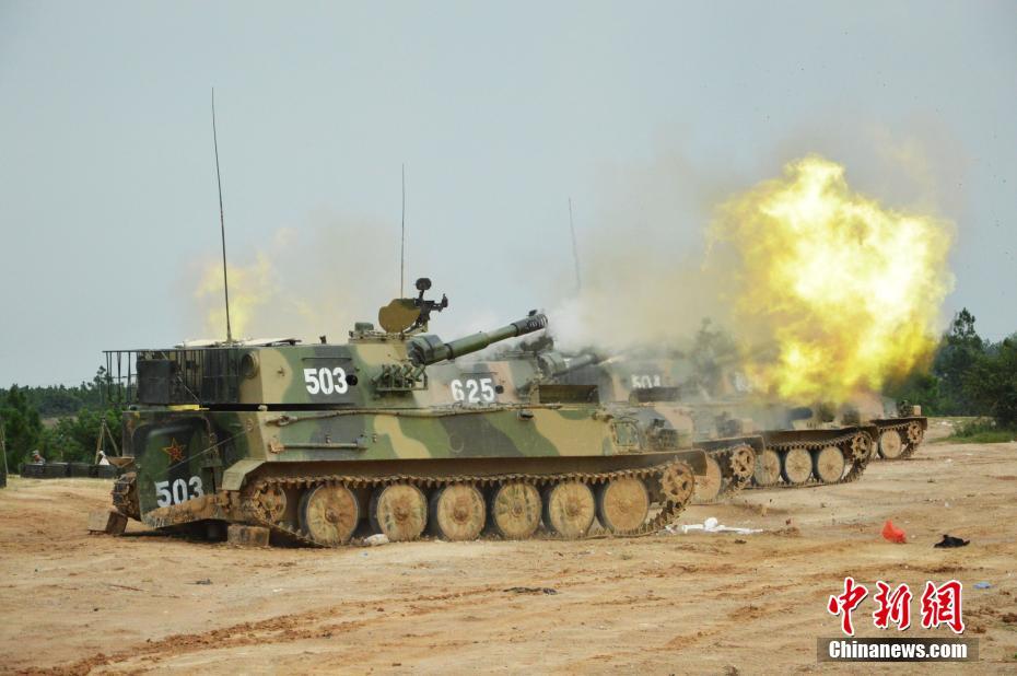 近日,陆军第71集团军某合成旅在皖东腹地组织炮兵分队进行年度实兵实弹战术考核,通过连续变换射击阵地、连续变换射击火器、连续变换射击目标,检验部队在实战条件下战术运用和火力打击能力。图为火炮齐射。 中新社发 李政 摄