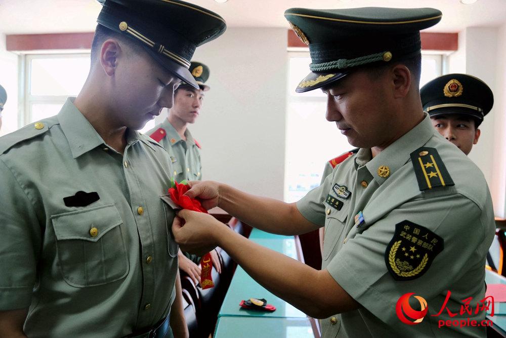一名干部为卸下标志服饰的退役老兵带上鲜艳的大红花。姜润邈摄