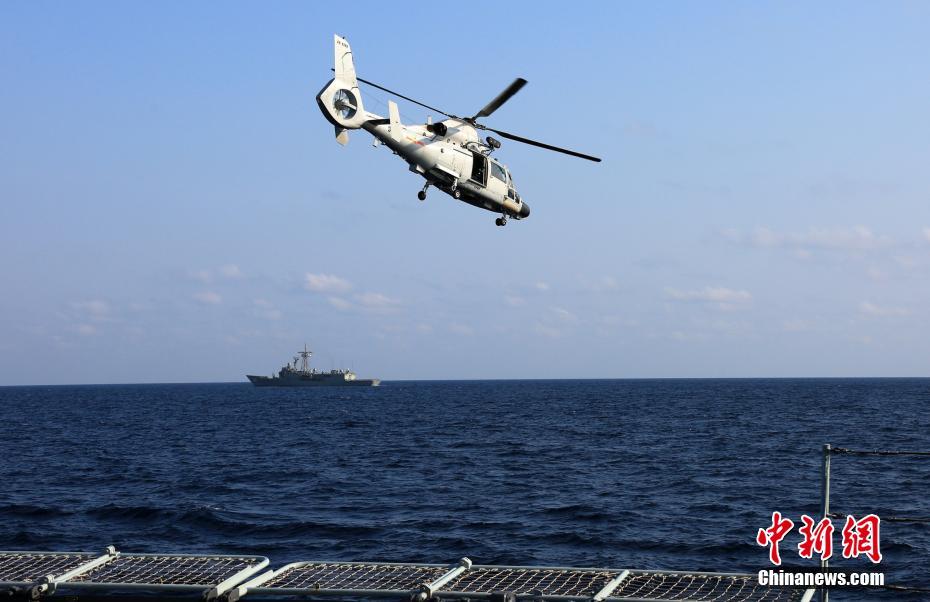 9月9日,澳大利亚“卡卡杜-2018”多国海军联合演习进入海上阶段第四天,代表中国海军参演的黄山舰在达尔文外海与澳大利亚、斯里兰卡、菲律宾等国海军共同参加了营救落水人员、航行补给占位、特混小队对抗等科目演练。图为黄山舰舰载直升机紧急起飞,前出执行搜救落水人员任务。 中新社发 徐广 摄