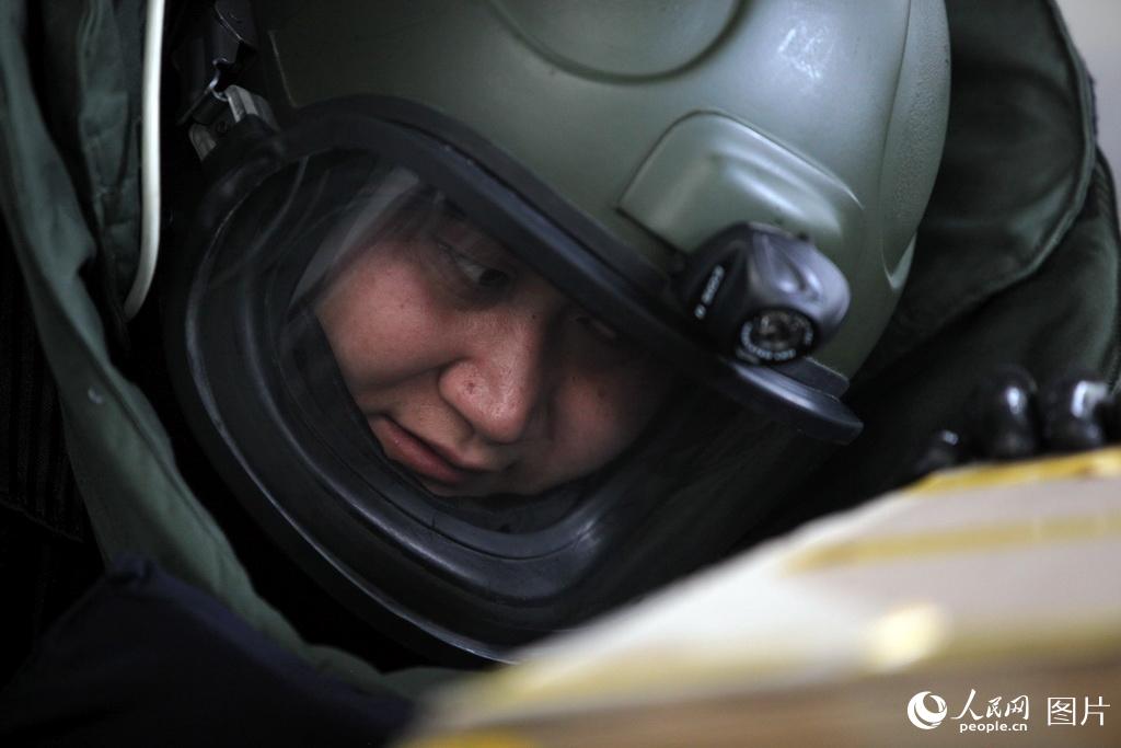 李巍在训练中准备处置疑似爆炸物品。(王晓丹 摄影)
