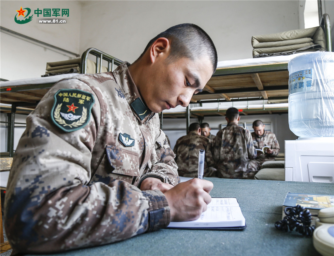 新战士谢宁正在班内撰写日记。刘晓东摄