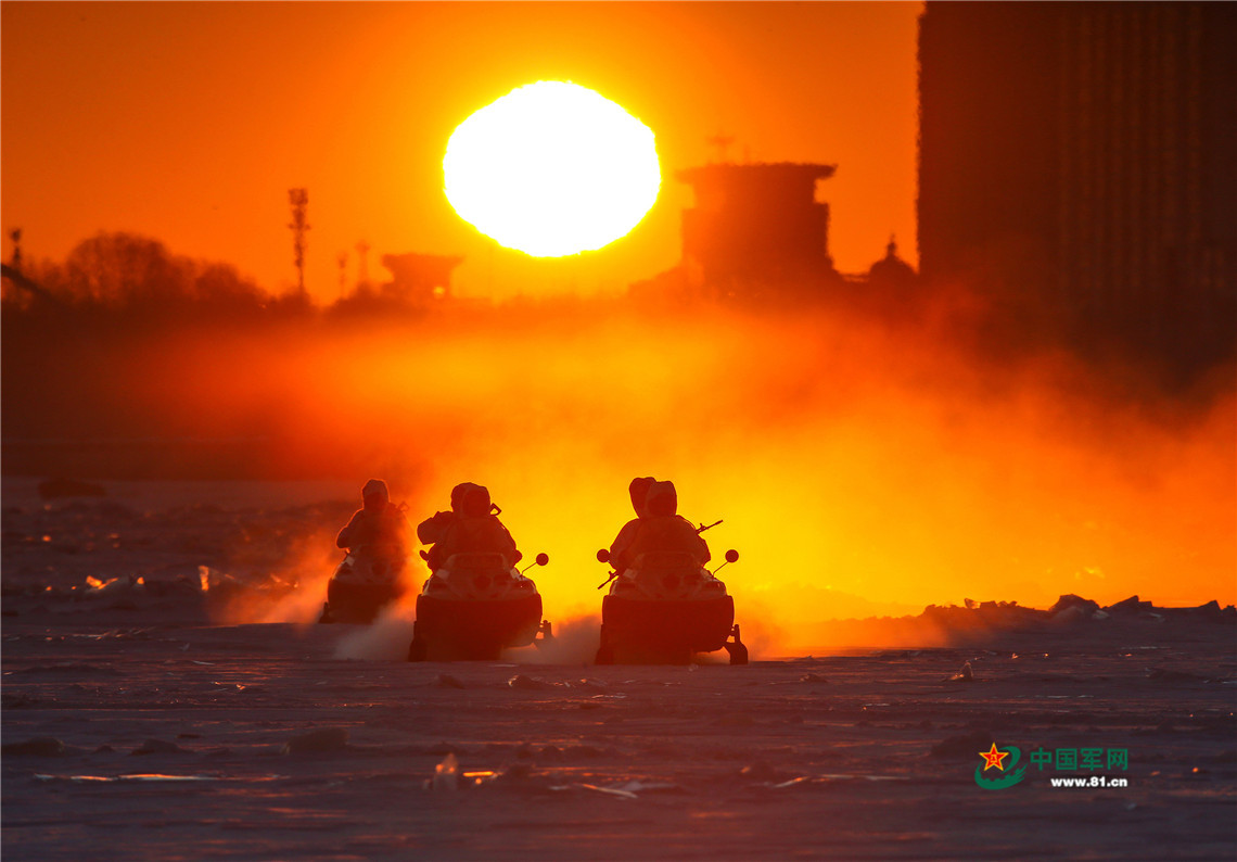 北部战区陆军某边防旅“黑河好八连”官兵冒着严寒进行边境封控演练。