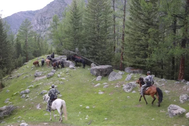 4个人,15匹马,抛开山路的艰辛不说,跑前跑后驱赶也是一个体力活儿。萨力哈尔说,途中有一段断崖格外危险,一边是垂直的峭壁,一边是奔腾的河流,不足一米的狭窄山路仅容一马通行,人骑在马背上脚都要蜷缩起来。曾经,他最喜欢的43号军马就是在那儿牺牲的。