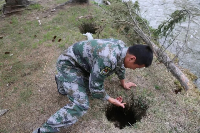 河边的几棵松树间,官兵用纱布围成一方小天地,里面拉上铁丝,将肉质品挂到其中,山里的温度放下三五天不成问题。“储肉间”的地上挖有三个50多公分的地洞,洞底垫有纱布,通往河里,一些不耐久放的食物可以放置在洞中,这是官兵借助冰凉的河水自制的“天然冷藏室”。