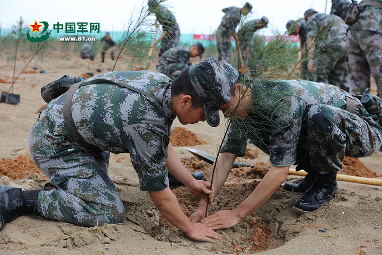 东部战区陆军某海防旅官兵为驻地添新绿。