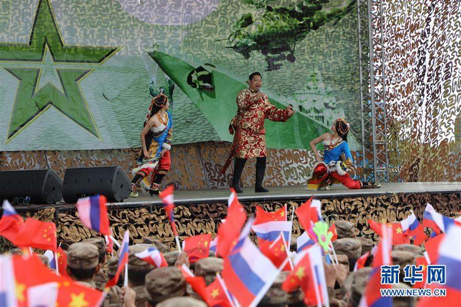 9月14日,在俄罗斯楚戈尔训练场,中国军队战地文艺队参加中俄战地联合文艺演出。 新华社记者樊永强摄
