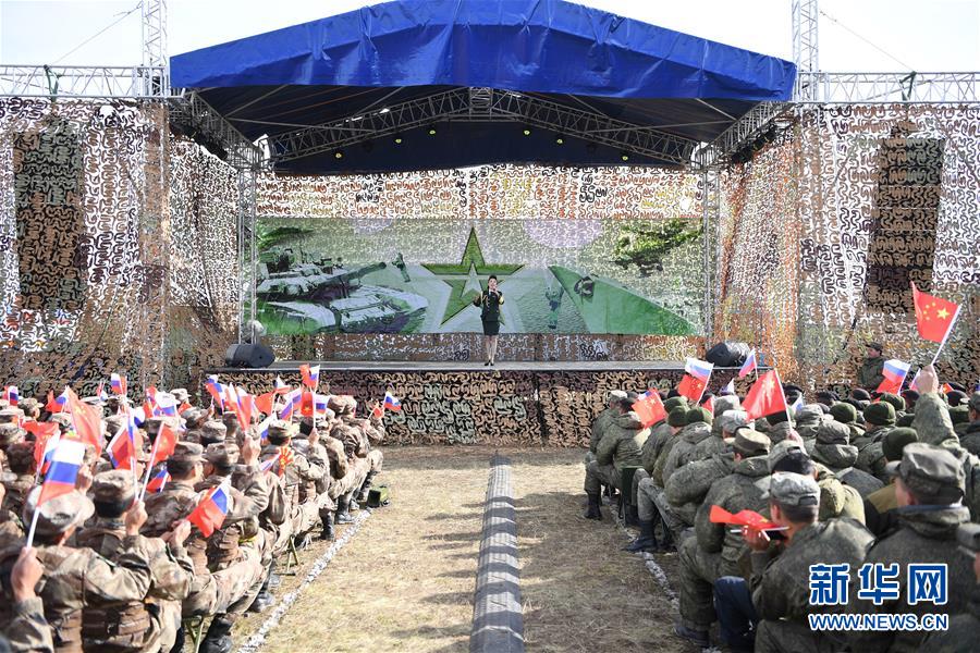 9月14日,在俄罗斯楚戈尔训练场,中国军队战地文艺队队员在中俄战地联合文艺演出上表演。 新华社发(杨再新摄)