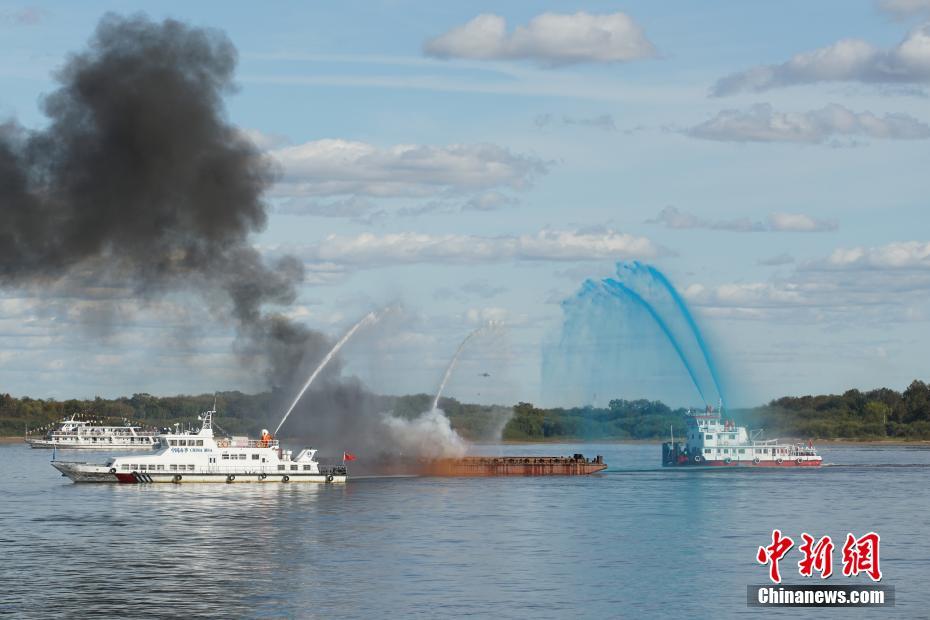 9月14日,中俄两国在黑龙江举行中俄界河应急联合演习,动用中方船艇25艘、无人机1架;动用俄方船舶10艘、飞机3架。图为演习现场,消防船灭火。中新社发 黑龙江海事局供图