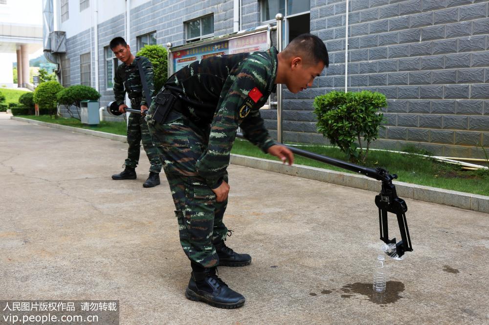 排爆手,是个特殊而又高危的职业。他们在“战场”不需要围观者的呐喊助威,没有队员的提醒帮助,有的只是在自己的“无声世界”里瞬间判断,解除危险。2018年9月16日,武警广西总队崇左支队特战队员采取手工作业与机械作业相结合的方式,重点对现地搜爆、转移销毁爆炸物等课目进行训练。训练中,武警排爆手身穿30多公斤重的排爆服在高温天气下进行搜排爆,提高部队在复杂环境下的综合处置能力。王俞/摄