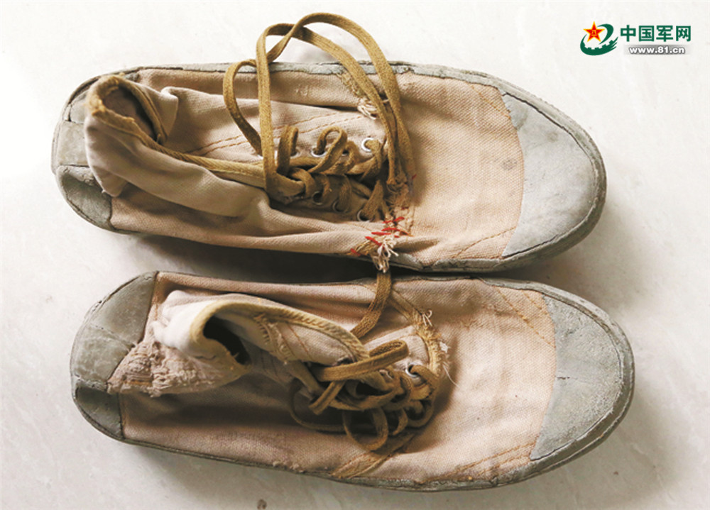 王继才生前穿过的黄胶鞋。因岛上空气湿度大、盐分高,胶鞋已严重褪色变形。