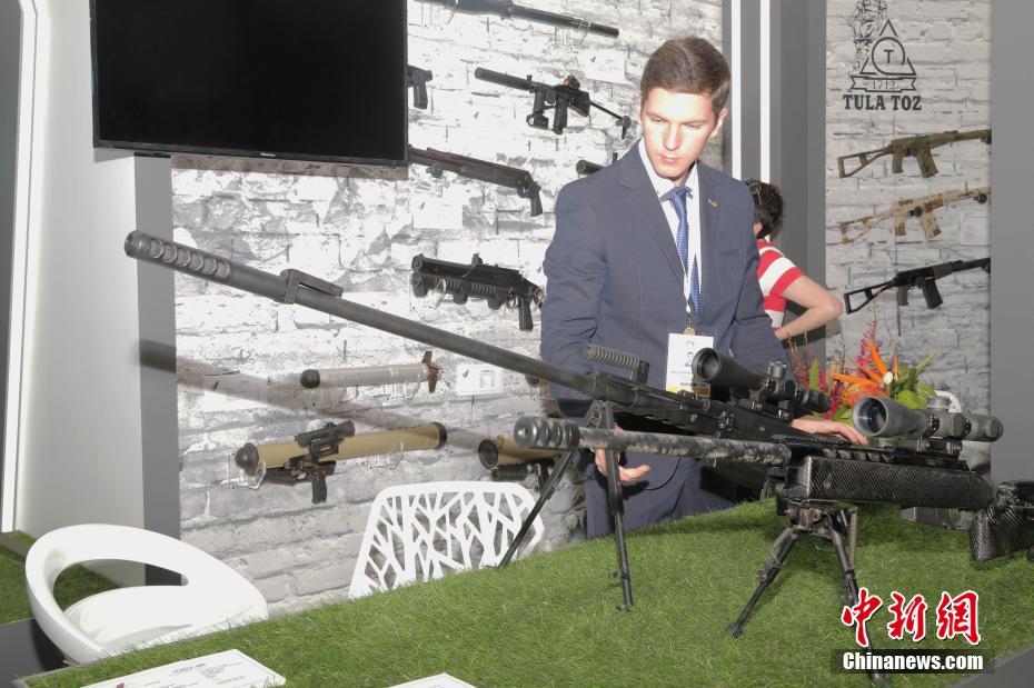 9月19日,为期五天的2018年非洲航空航天与防务展在南非比勒陀利亚开幕,中国国家国防科技工业局组织6家军贸公司以“中国防务”国家展团形式参展,旨在推动中国军工优势装备“走出去”。图为俄罗斯两款新型步枪OSV-96、VKS亮相此次防务展。中新社记者 王曦 摄