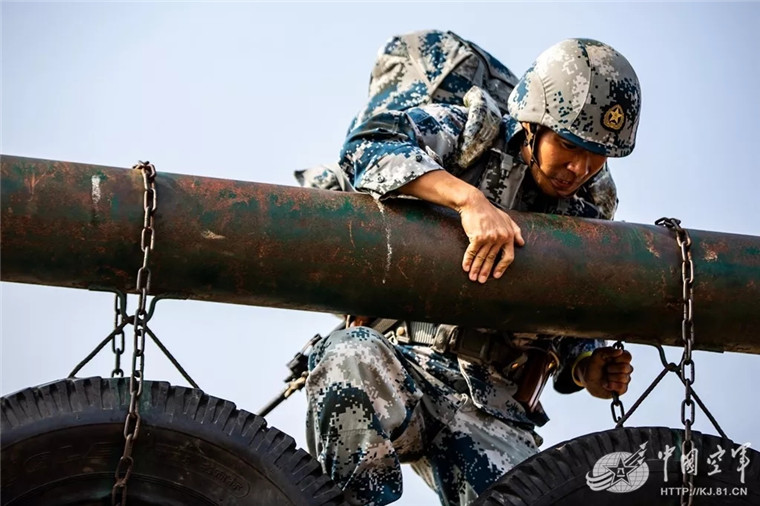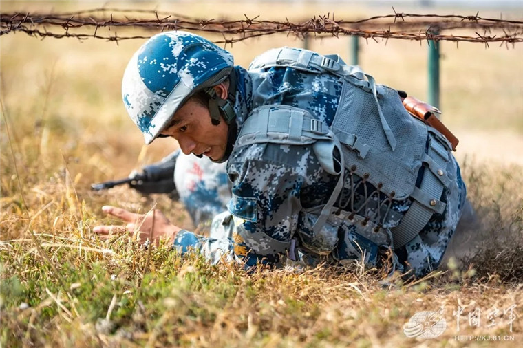 空中渗透结束后,参赛队员马不停蹄来到越障课目考核点。在这一课目比拼中,队员要携带约30公斤的武器装备,按照指定路线完成越障、山地攀登及跨越水障等内容,模拟实战中可能遇到的各类典型障碍,检验官兵空降着陆后战场突防能力。