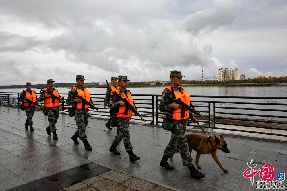 驻守在黑河口岸的解放军是一支全军名连——“黑河好八连”,他们常年担负黑河市正面边境24.5公里辖区的战备执勤任务。1969年6月建连以来,历代官兵视祖国荣誉高于一切,以“下江代表祖国、上岸代表军队”的责任感,出色地完成了战备执勤等各项战备任务,锻造和培育了“不畏艰苦,爱国奉献,严守国门,一尘不染”的“黑河好八连精神”。图为该连队战士徒步沿江巡逻。中国网记者 董宁 摄影