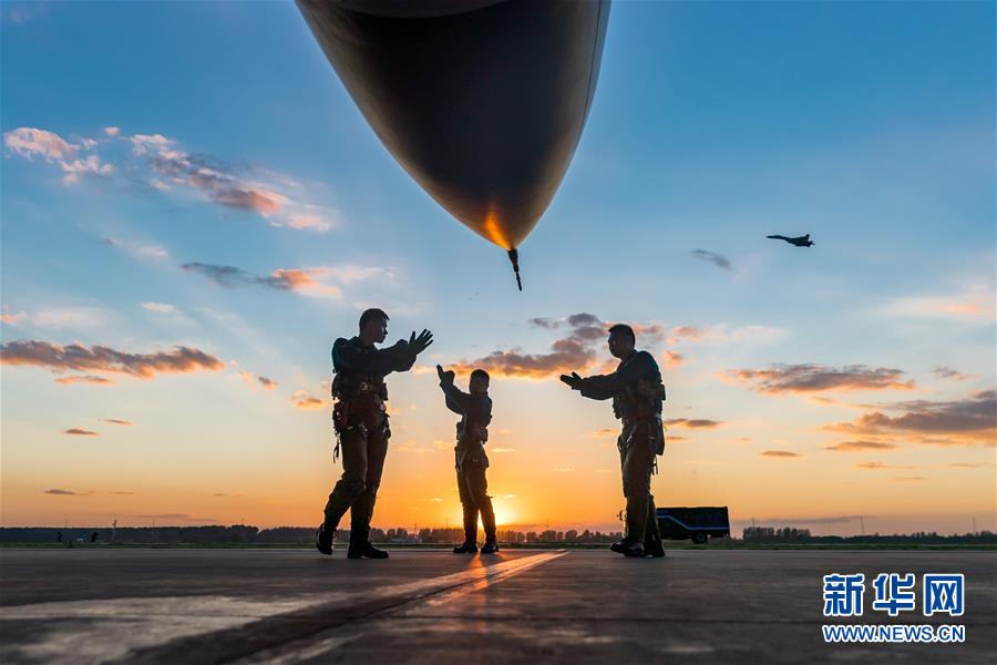 即将升空进行二对一自由空战训练的空军“先锋飞行大队”飞行员在战机前进行演练(9月7日摄)。 新华社发(杨盼 摄)