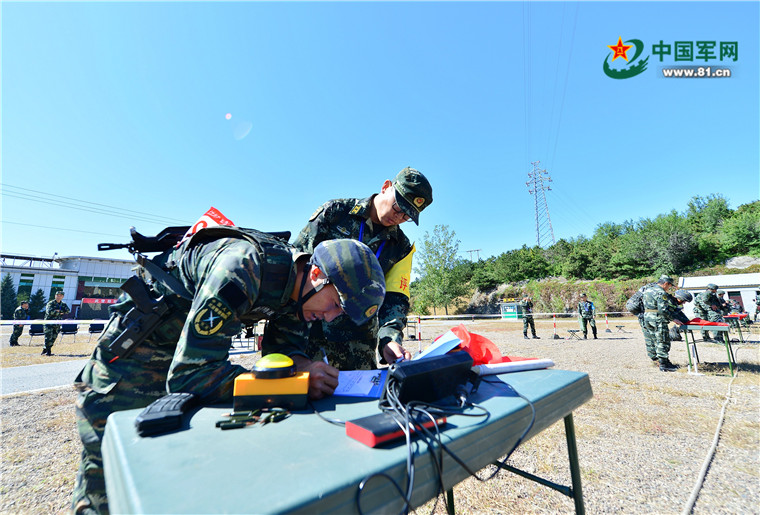 9月24日,在2公里武装越野射击比武课目中,参赛队员现场核对成绩。曹峰摄。