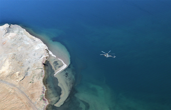 直升机巡逻于边境上湛蓝美丽的高原湖泊