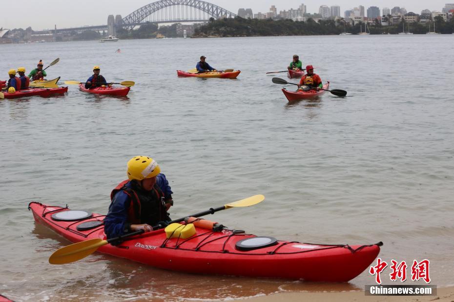 9月26日,“熊猫袋鼠—2018”中澳陆军联合训练在悉尼港举行皮划艇训练。这是中澳陆军第四次举办双边联训,双方各派出10名官兵参加。中方参训分队由南部战区陆军74集团军某旅官兵组成。图为中澳参训队员联合训练中。 中新社记者 陶社兰 摄