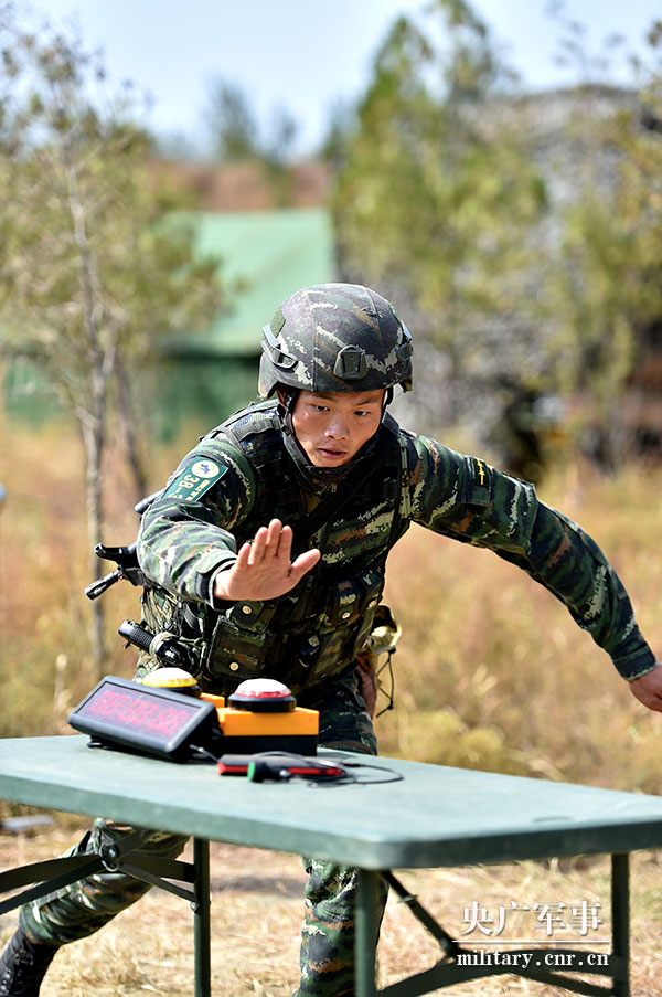 9月25日,搜索识别射击课目比武中开始后,一名参赛队员迅速按下计时器。曹峰摄